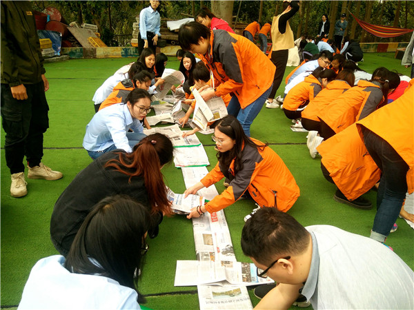破冰完,就進(jìn)入正式的團(tuán)建活動(dòng)了。今天的活動(dòng)主要是培養(yǎng)大家動(dòng)手協(xié)作能力,所以風(fēng)火輪是大家自己動(dòng)手做出來的。大家分好組后,在教練的指導(dǎo)下,按照要求用事先準(zhǔn)備好的膠紙、報(bào)紙做出一條可以容納10人同時(shí)站立的閉合履帶,然后各組隊(duì)員站在本組的履帶內(nèi)向前行進(jìn),用時(shí)最短的隊(duì)伍成績最優(yōu)。從最后的比賽結(jié)果來看,果然是做任何事情前,都需要有充分的考慮和準(zhǔn)備。這個(gè)項(xiàng)目對(duì)團(tuán)隊(duì)的協(xié)作配合能力要求非常高,準(zhǔn)備的越充分,配合的越好用時(shí)就越短,任務(wù)執(zhí)行中問題就越少,自然成績就越優(yōu)秀。